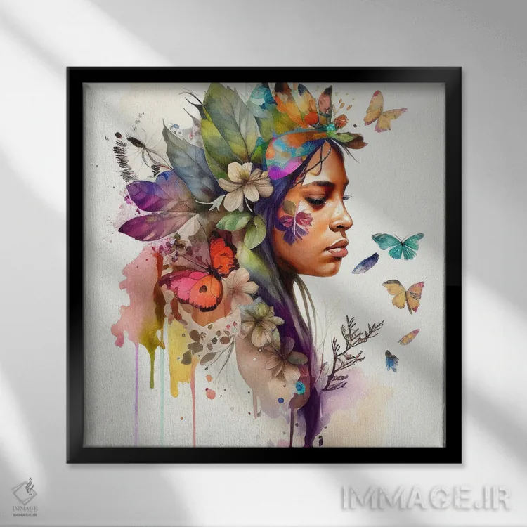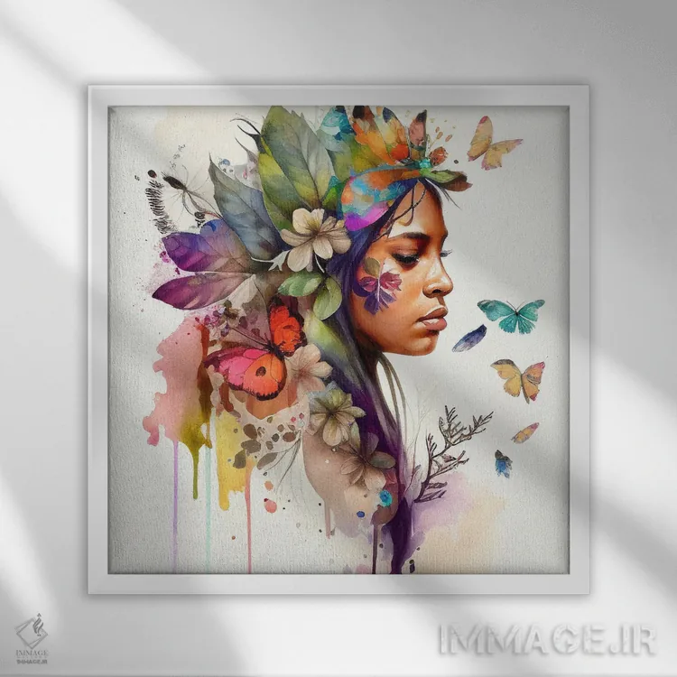«زن بومی هندی با گلهای آبرنگی ۱۰» اثرِ «استودیو کروماتیک فیوژن» از آن کارهاییست که هم چشم را میگیرد، هم با چیدمانهای مختلف راحت ست میشود—بهخصوص در تم این اثر.