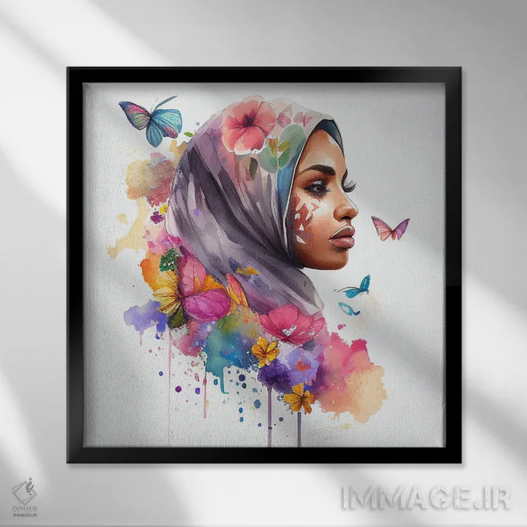 تابلو دکوراتیو زن عرب مسلمان با گل های آبرنگی هفتم اثر استودیو کروماتیک فیوژن