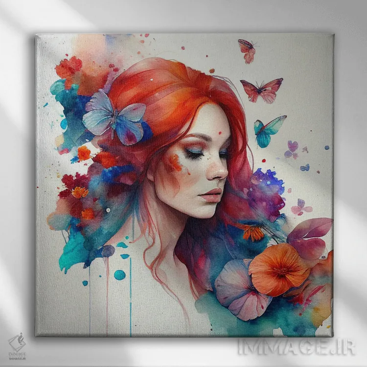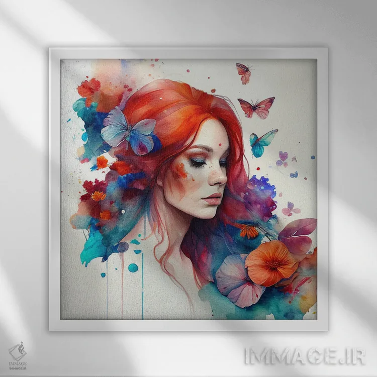 تابلو زن مو قرمز با گلهای آبرنگی چهارم اثر استودیو کروماتیک فیوژن