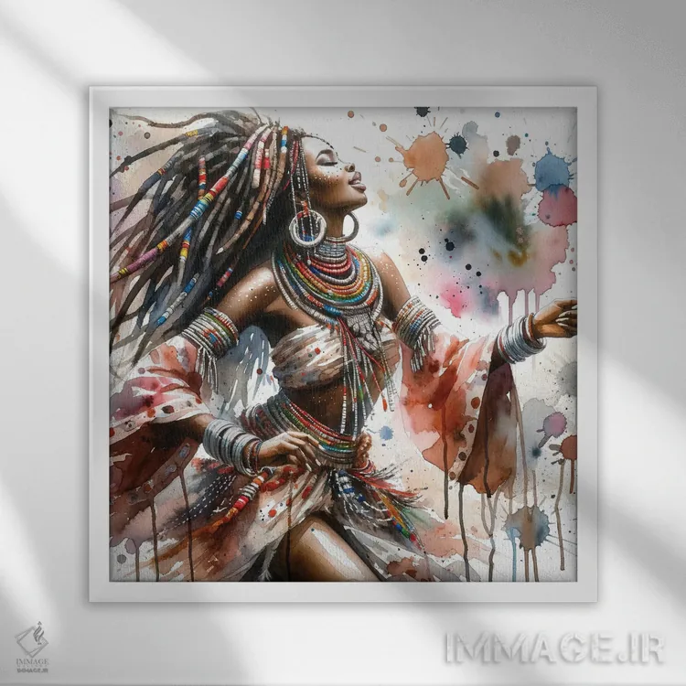 تابلو رقصنده آفریقایی آبرنگی II اثر استودیو کروماتیک فیوژن - نمای قاب‌دار سفید