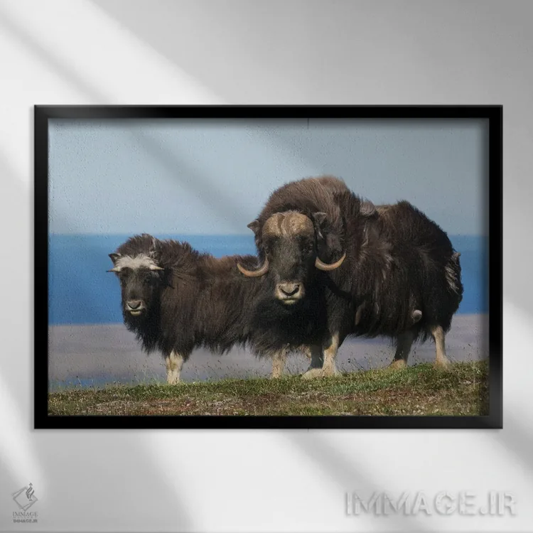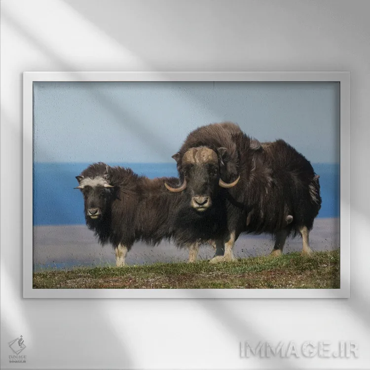 برای دیوارهای ساده، «گاومیشمشکیهای شمالی در مقابل دریای برینگ» اثرِ «کن آرچر» فضا را صمیمیتر و دعوتکنندهتر نشان میدهد؛ برای فضاهای روستیک یا بوهو انتخابی خوشسلیقه است. هر بار نگاهش میکنید، یک جزئیات تازه به چشم میآید.