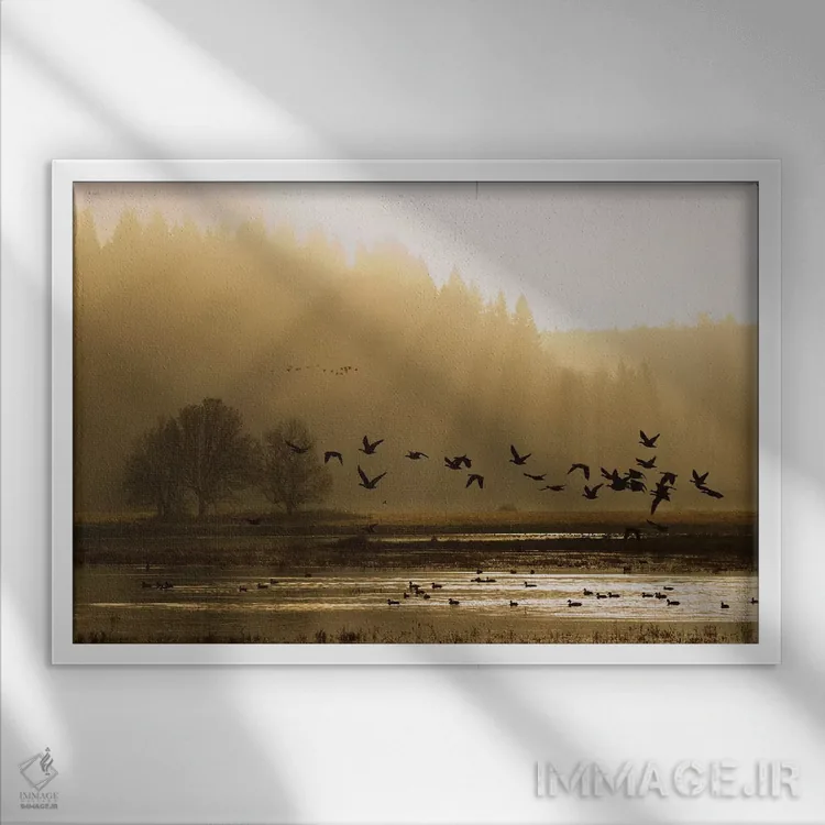 براساس پالت گرم اثر، قاب بلوط روشن (چوبی) پیشنهاد اول است و استخوانی ملایم مکمل. برای سفارشهای پروژهای با ابعاد و قابهای اختصاصی با ایماژ در تماس باشید.