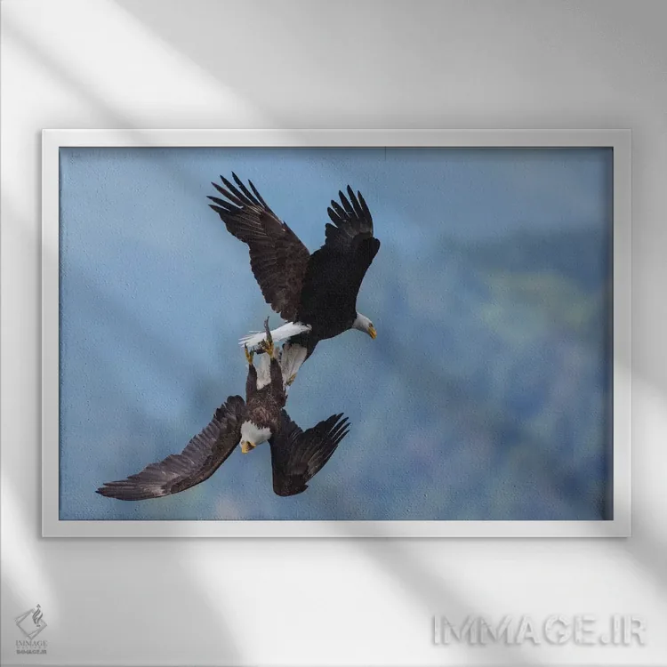 «عقاب سرسفید در نبرد هوایی برای غذا» اثرِ «کن آرچر» از آن کارهاییست که مثل یک امضای بامزه اما متین عمل میکند؛ برای دکورهایی با رنگهای خنثی انتخاب خوبیست. هر بار نگاهش میکنید، یک جزئیات تازه به چشم میآید.