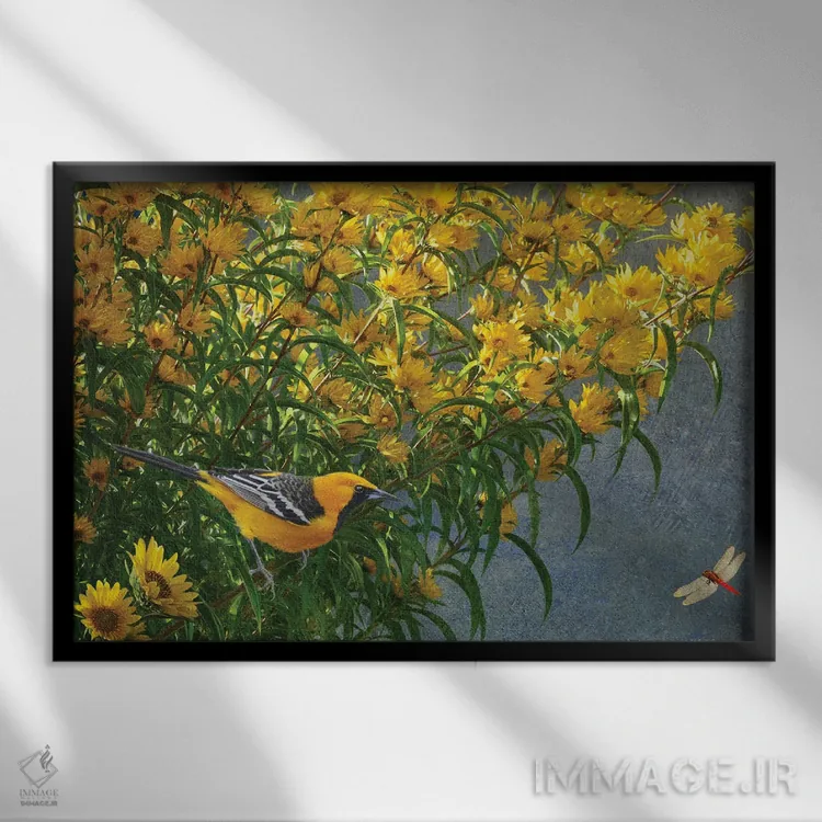 تابلو بلبل گل‌های زرد اثر کریستوفر وست - نمای قاب‌دار مشکی