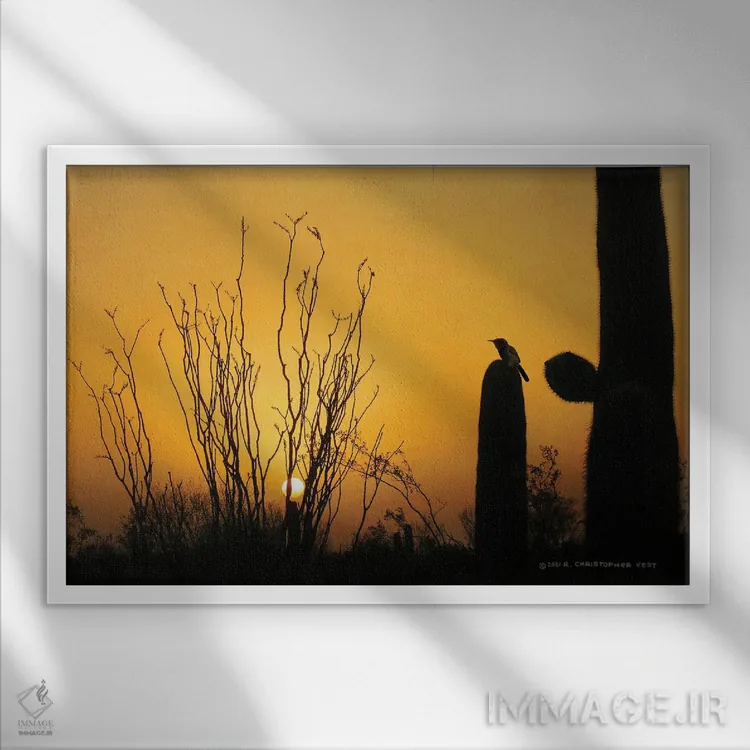 تابلو مرغ خارخار غروب با کاکتوس (پرنده) اثر کریستوفر وست - نمای قاب‌دار سفید