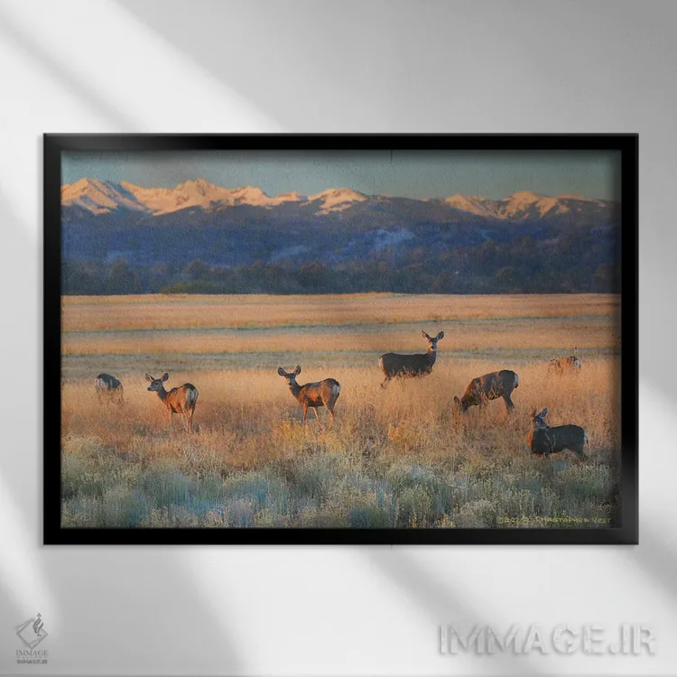 تابلو غزال در غروب اثر کریستوفر وست - نمای قاب‌دار مشکی