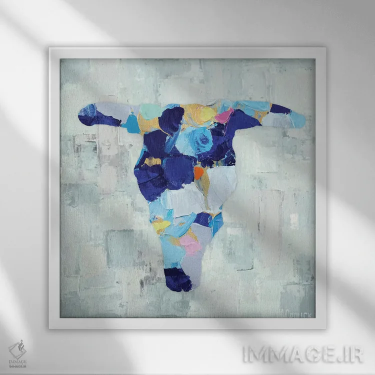 تابلو جمجمه گاو موزائیکی اثر آن مری کولیک - نمای قاب‌دار سفید