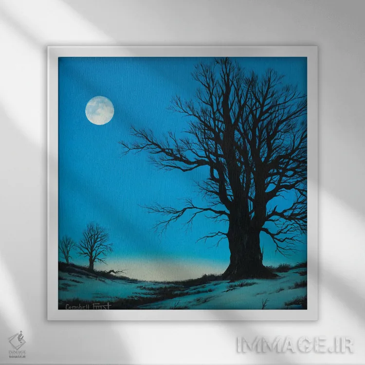 براساس پالت سرد اثر، قاب سفید مات (فریم باریک) پیشنهاد اول است و نقرهای برسخورده (متالیک) مکمل.