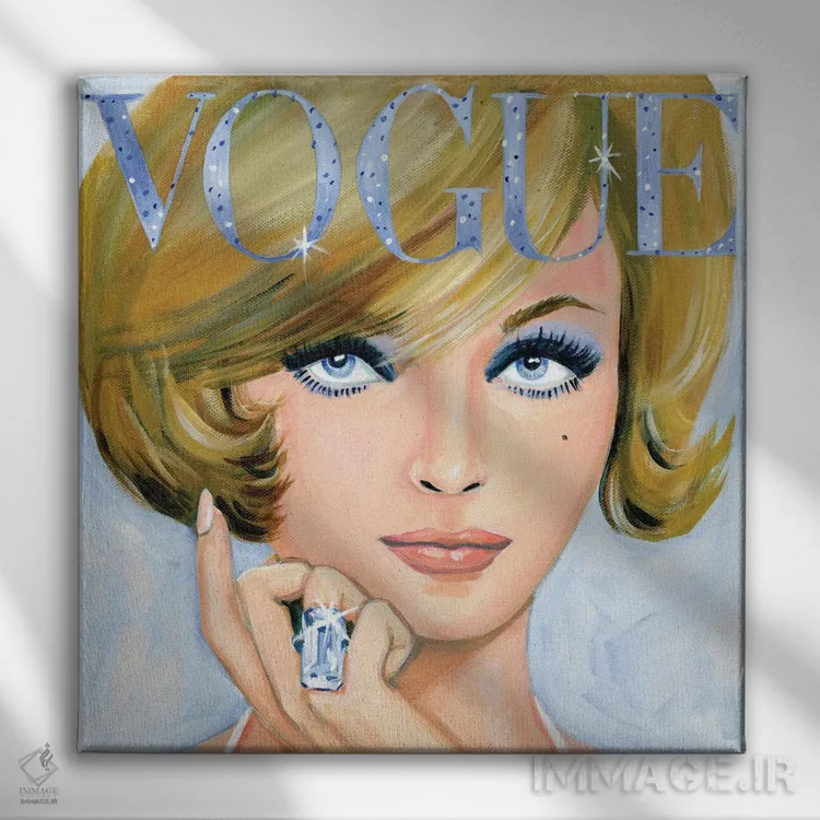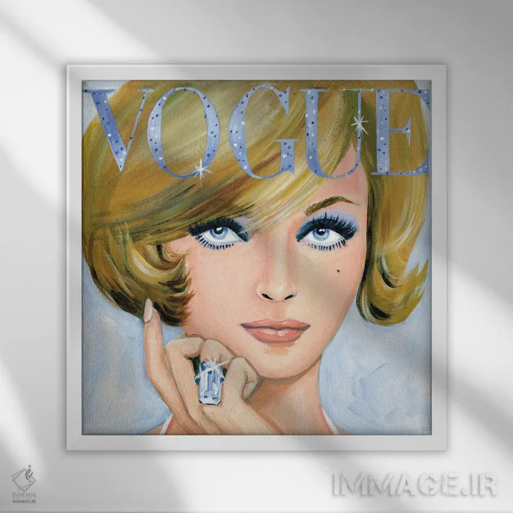 این تابلو با عنوان «جلد ووگ با تزئینات قدیمی و درخشان (مد)» اثرِ «کتی مینگوس»، کنار آینه و رختکن یا اتاق لباس عالی مینشیند.