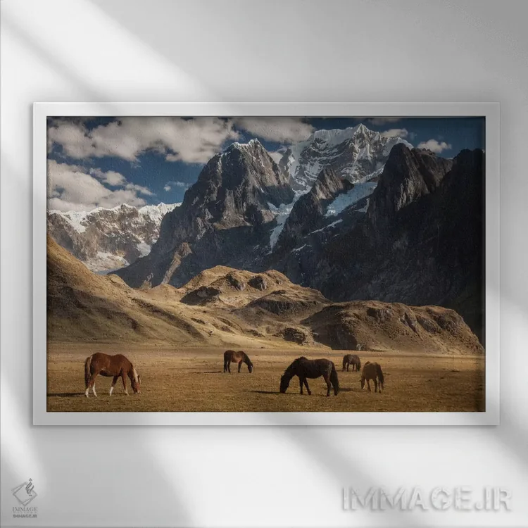 «گله اسب اهلی در حال چرا در زیر سیولا گرانده، نزدیک دریاچه کارواکوچا، رشته کوه وایهوآش، آند، پرو» اثرِ «کالین مونتیث» از آن کارهاییست که در کنار رنگهای خنثی، تضاد دلچسبی میسازد؛ برای هدیهدادن به دوستداران حیوانات انتخاب خوبیست. حسش صمیمی است، اما کیفیتش جدی و خوشپرداخت.