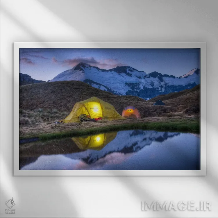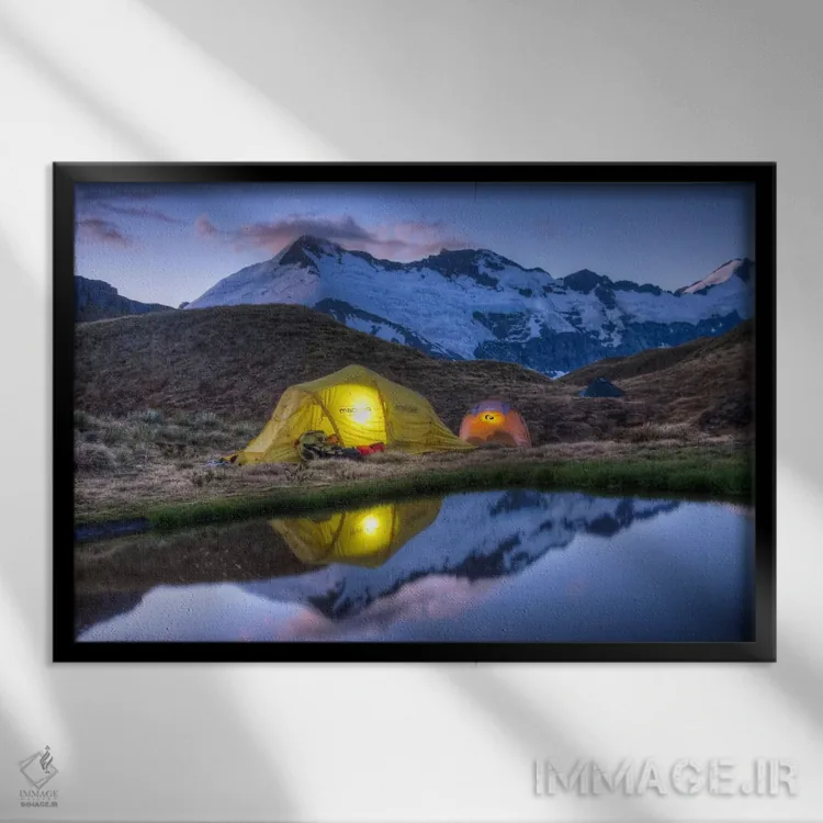برای دیواری که دوست دارید «حرف داشته باشد»، «کمپزنها در چادرهای روشن با چراغقوه مطالعه میکنند، کسکید سدل، پارک ملی کوه اسپایرینگ، نیوزیلند» اثرِ «کالین مونتیث» بدون شلوغکاری، توجه را دقیق جمع میکند؛ برای کافهها و فضاهای عمومی کوچک پیشنهاد میشود. در کنار نورپردازی نقطهای، جلوهاش حرفهایتر میشود.