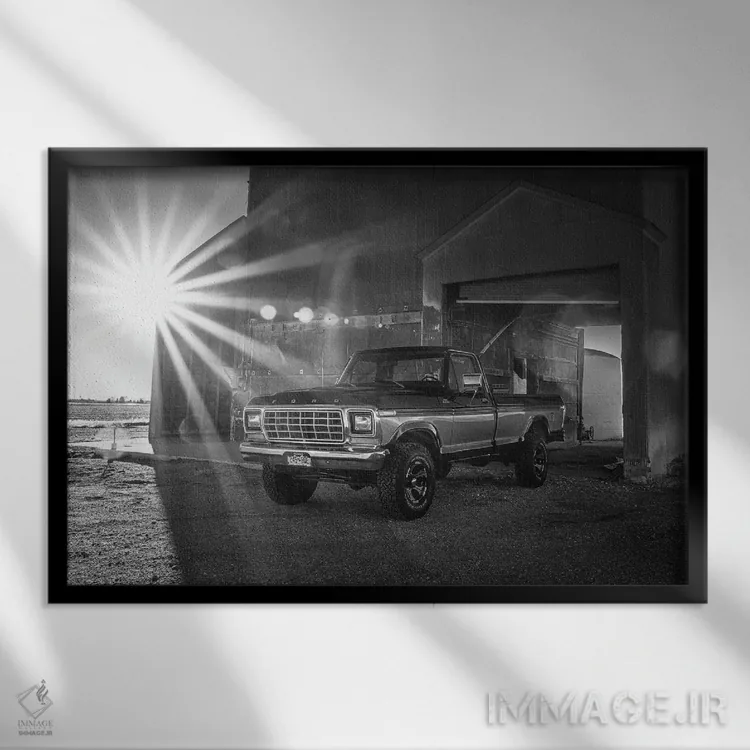 «فورد F—150 سفارشی ۱۹۷۹ (تکرنگ)» اثرِ «کریستوفر توماس» در فضای عکاسی سیاهوسفید، روی نور و کنتراست تکیه میکند؛ موضوعِ این اثر برای دکورهای مینیمال عالی است.
