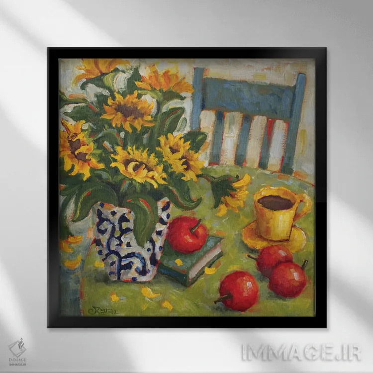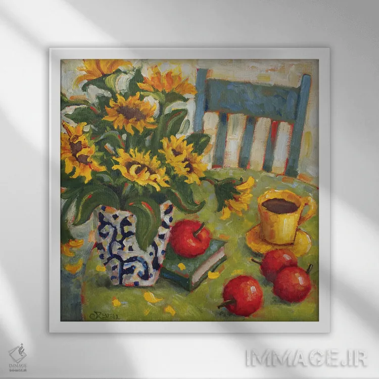 براساس پالت ترکیبی اثر، قاب تیک گرم (چوبی) پیشنهاد اول است و مشکی مات (فریم متوسط) مکمل. برای سفارشهای پروژهای با ابعاد و قابهای اختصاصی با ایماژ در تماس باشید.