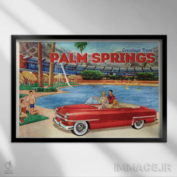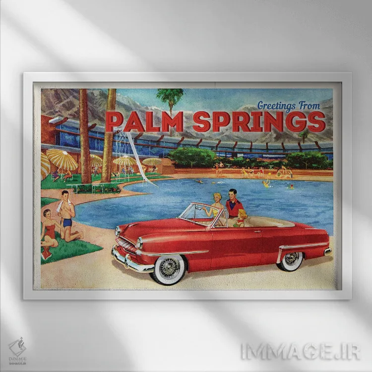 تابلو سفر به پام اسپرینگز ۱ اثر سَتردی ایونینگ پُست (مجله و برند هنری آمریکایی) - نمای قاب‌دار سفید