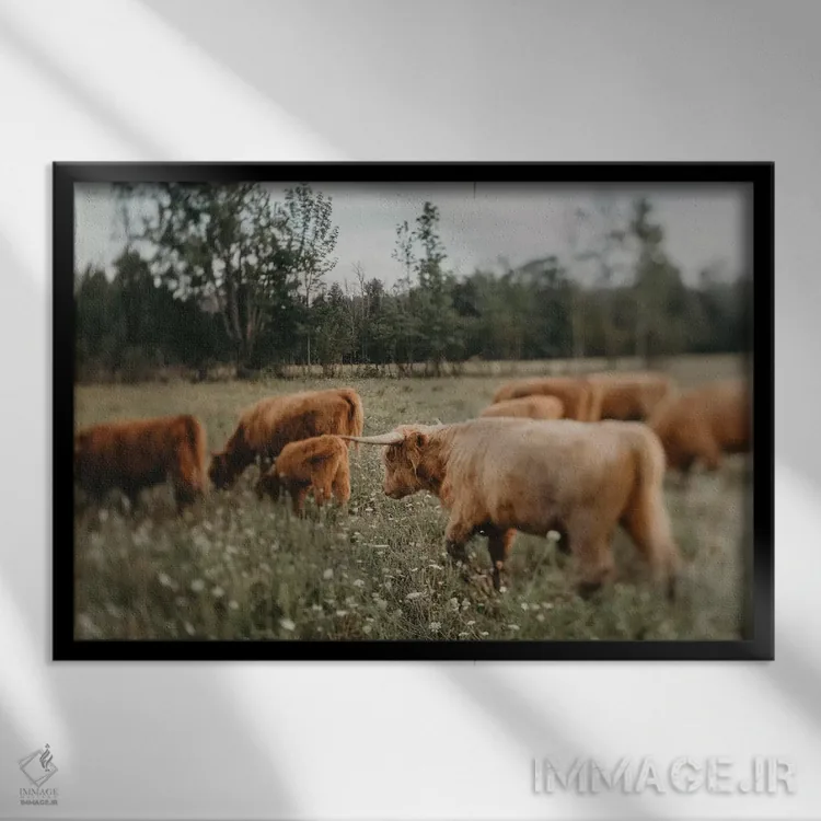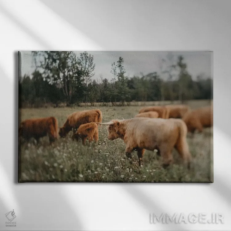 برای دکورهای صمیمی، «گاوهای ییلاقی (نژاد اسکاتلندی)» اثرِ «چلسیا ویکتوریا» به فضا، گرمیِ ملایم اضافه میکند؛ برای دکورهایی با رنگهای خنثی انتخابی خوشسلیقه است. با نورپردازی نقطهای، جذابتر هم میشود.