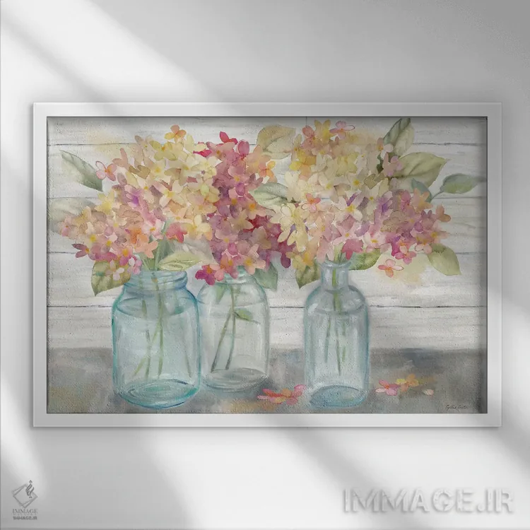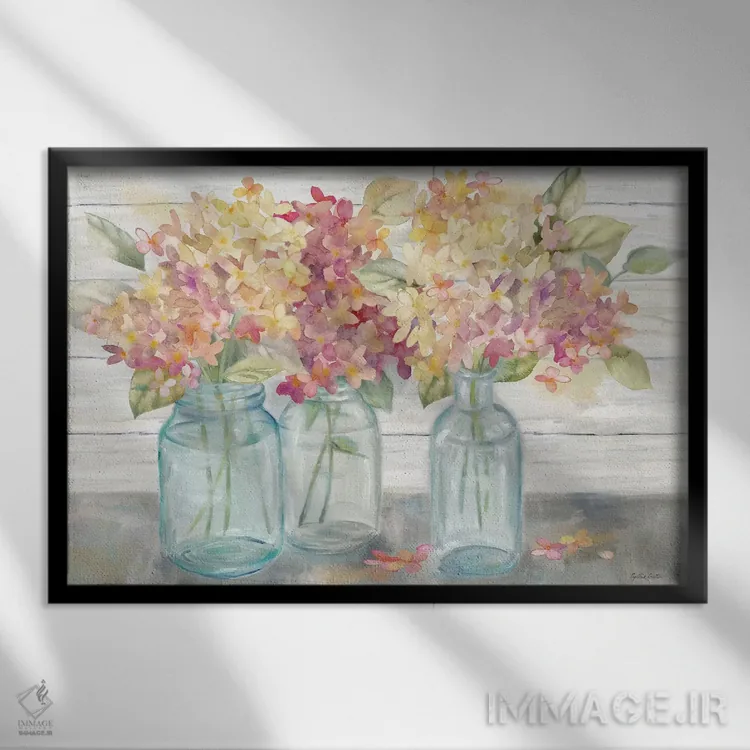 «هورتانسیاهای خانه روستایی در شیشههای میسون ادویه» اثرِ «سینتیا کولتر» مثل یک نفس تازه است؛ برای دیوارهای ساده، یک لطافتِ دقیق میسازد؛ برای کنار میز آرایش یا کنسول انتخابی خوشسلیقه است. اگر دنبال «زیباییِ بیصدا» هستید، این اثر همان حس را دارد.