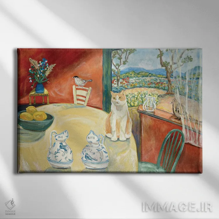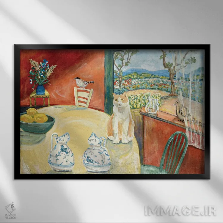براساس پالت گرم اثر، قاب بلوط روشن (چوبی) پیشنهاد اول است و استخوانی ملایم مکمل. برای سفارشهای پروژهای با ابعاد و قابهای اختصاصی با ایماژ در تماس باشید.