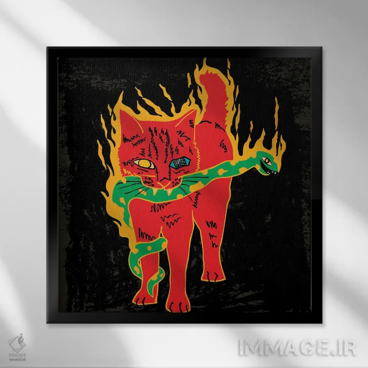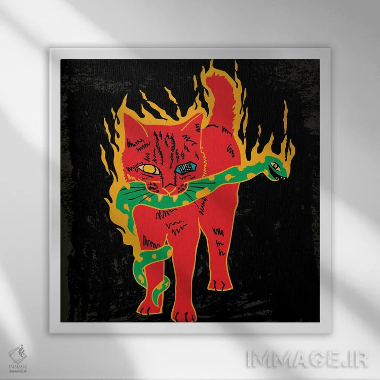 تابلو گربه و مار (شعله‌های زرد) اثر دای کریس آرت (هنرمند) - نمای قاب‌دار مشکی