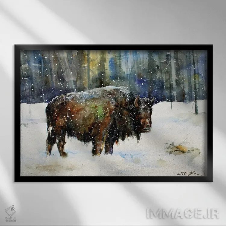 «گاومیش کوهاندار (بایسون)» اثرِ «باور کراوزر» ترکیببندی متعادل دارد و به دیوار وقار میدهد؛ بدون اینکه فضا را سنگین کند.