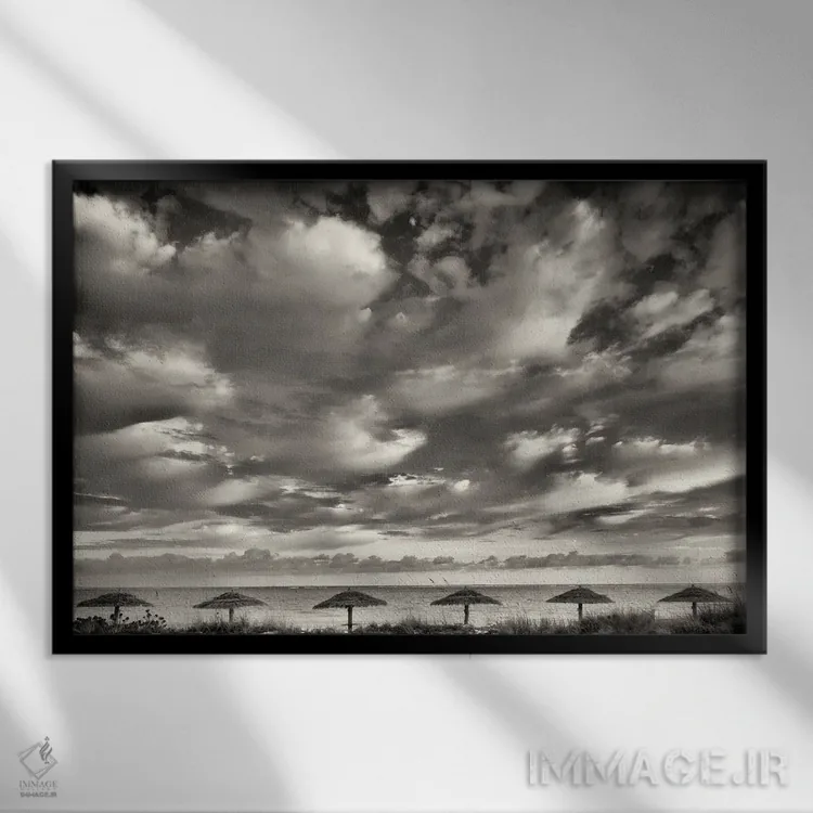 «چترهای گرمسیری ۳» اثرِ «دنیس فراتس» در فضای عکاسی سیاهوسفید، روی نور و کنتراست تکیه میکند؛ موضوعِ این اثر برای دکورهای مینیمال عالی است.
