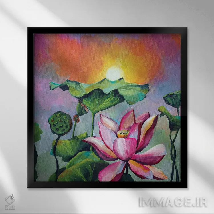 تابلو نیلوفر آبی آفتابی اثر دلنارا ال - نمای قاب‌دار مشکی