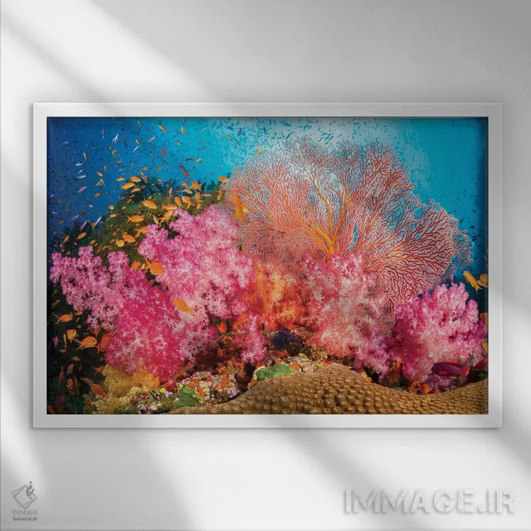 تابلو صخره‌های آلسیوناریا و گورگونی با گله ماهی آنتیاس، غالب بر این صحنه صخره‌ای فیجی اثر دیوید فلیتهام - نمای قاب‌دار سفید