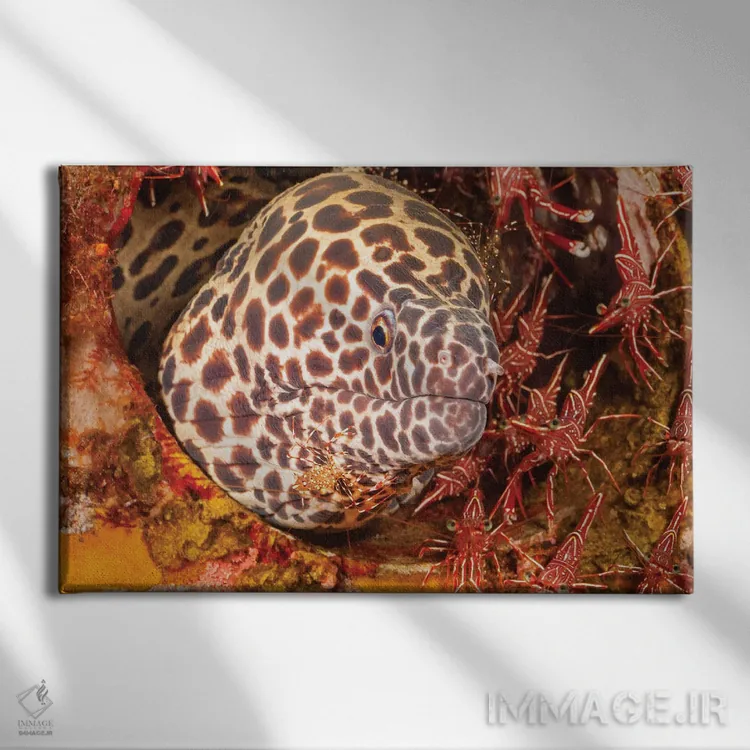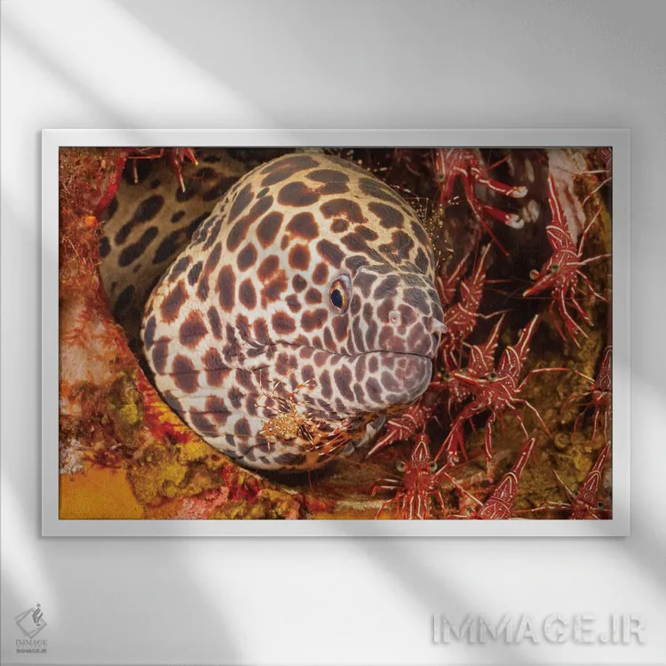 در نگاه اول، «Gymnothorax Favageneus، Surrounded By Hinge—Beak Shrimp And A Cleaner Shrimp، یک مارماهی موری لانهزنبوری (Gymnothorax favageneus) احاطهشده توسط میگوهای منقارلولی و یک میگوی تمیزکننده» اثرِ «دیوید فلیتهام» ریتم فضا را منظم میکند؛ برای راهروها و ورودیهای مینیمال پیشنهاد میشود. به فضا حس «گالری خانگی» میدهد، بدون اینکه اغراق کند.