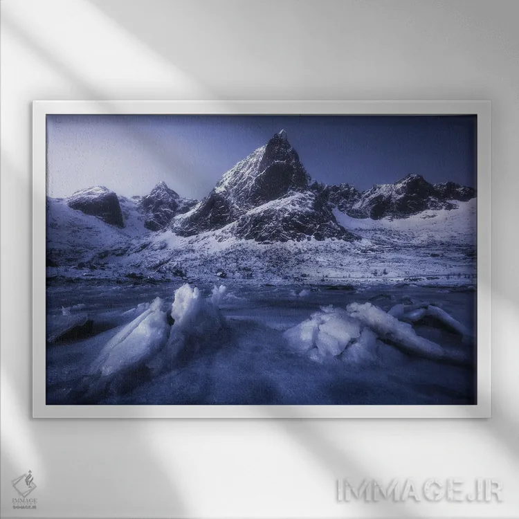 براساس پالت سرد اثر، قاب سفید مات (فریم باریک) پیشنهاد اول است و نقرهای برسخورده (متالیک) مکمل. برای سفارشهای پروژهای با ابعاد و قابهای اختصاصی با ایماژ در تماس باشید.
