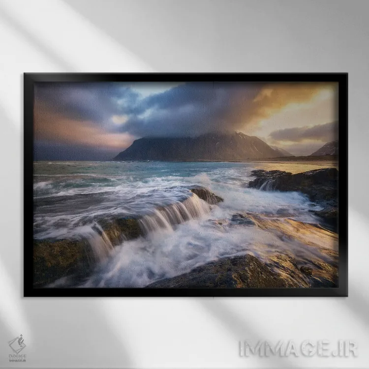 تابلو طلوع طلایی در ساحل اسکگ‌ساندن (لوفوتن) اثر دنیل گاستاگر - نمای قاب‌دار مشکی