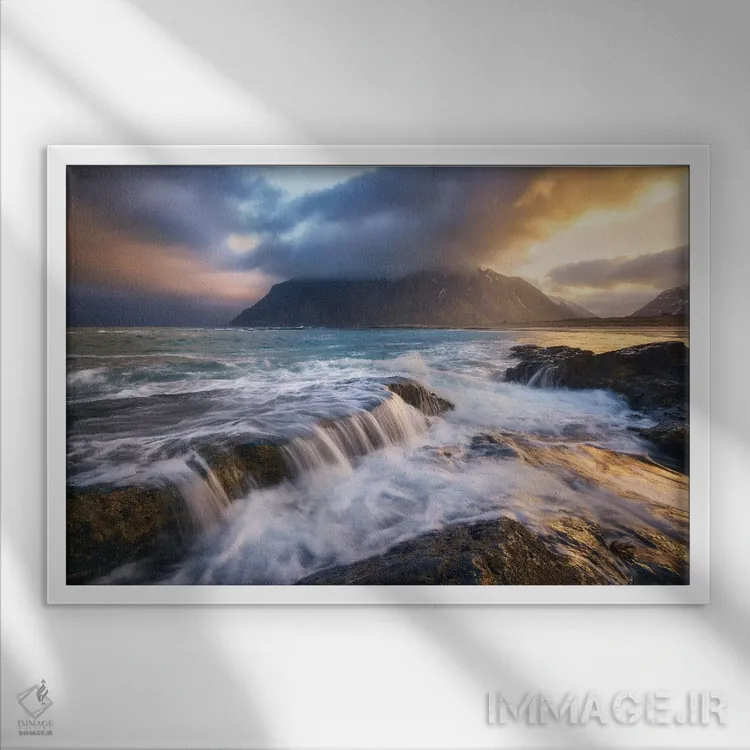 تابلو طلوع طلایی در ساحل اسکگ‌ساندن (لوفوتن) اثر دنیل گاستاگر - نمای قاب‌دار سفید