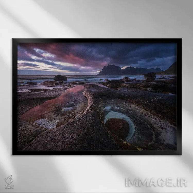 تابلو غروب رمزآلود در ساحل اوتاکلیو (نروژ) اثر دنیل گاستاگر - نمای قاب‌دار مشکی