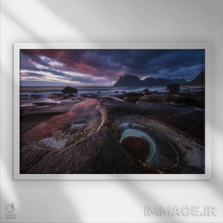 تابلو غروب رمزآلود در ساحل اوتاکلیو (نروژ) اثر دنیل گاستاگر - نمای قاب‌دار سفید