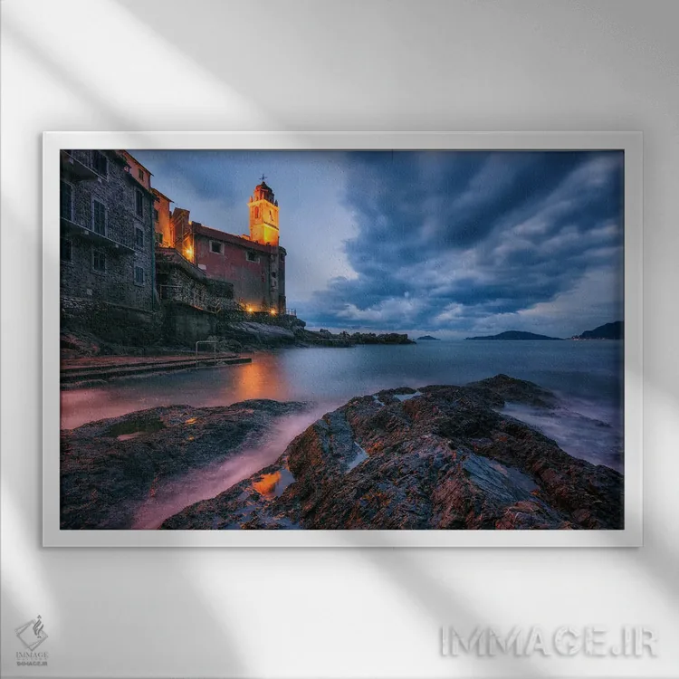 تابلو ساعت آبی در تلارو (ایتالیا) اثر دنیل گاستاگر - نمای قاب‌دار سفید