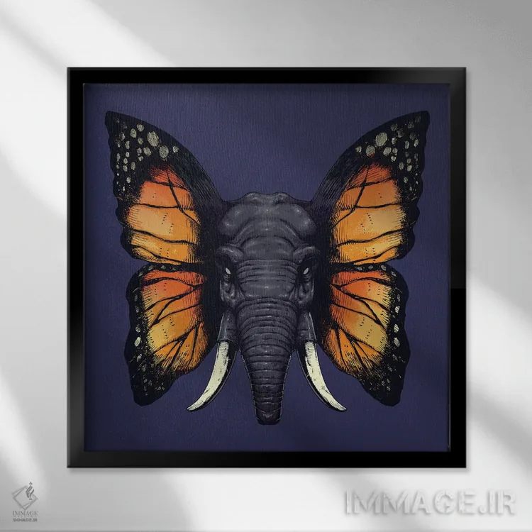 تابلو فیل‌پرنده (ترکیب فیل و پروانه/پرنده) اثر دیجیتال کاربین (نام هنرمند یا استودیو) - نمای قاب‌دار مشکی
