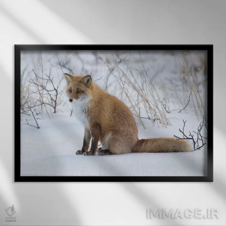 تابلو روباه قرمز نشسته در برف اثر دارل گالین - نمای قاب‌دار مشکی