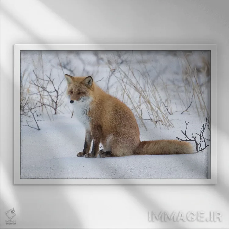 تابلو روباه قرمز نشسته در برف اثر دارل گالین - نمای قاب‌دار سفید