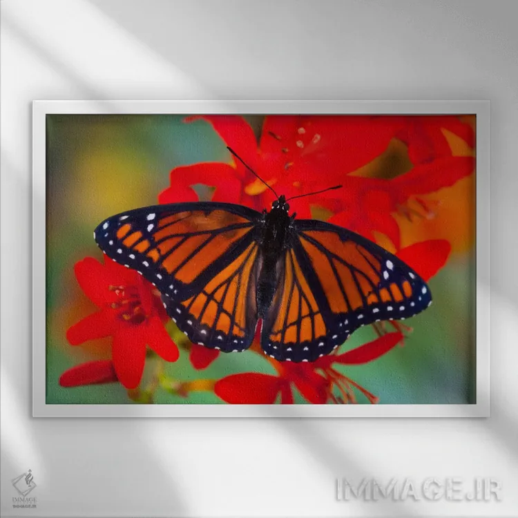 تابلو دکوراتیو پروانه وایسروی با بال های باز در میان کروکوزمیا اثر دارل گالین