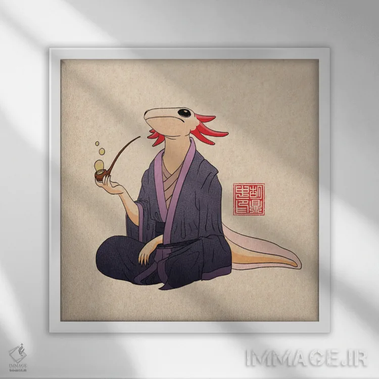 تابلو One Must Axolotl Questions,برای فیلسوف شدن باید سوال‌های اکسلوتل پرسید (بازی واژه: اکسلوتل = گونه‌ای دوزیست) اثر باورگ‌ژونگ هو - نمای قاب‌دار مشکی