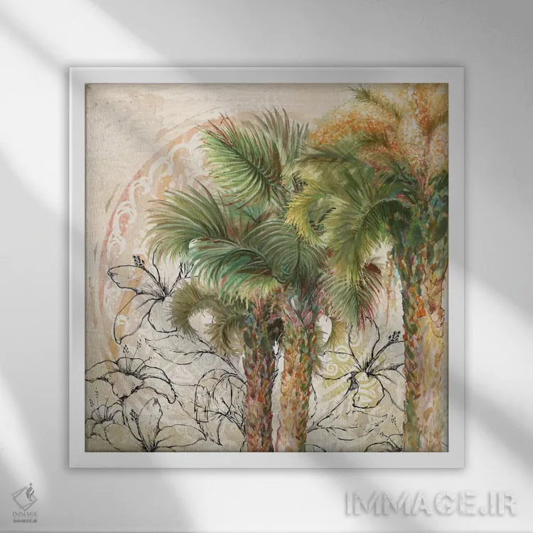 در «نخلها دور II» اثرِ «دیانآرت (نام هنری)»، گلها و گیاهان جزئیات نزدیک را چشمنواز نشان میدهد؛ برای فضای غذاخوری انتخابی خوشسلیقه است. برای دیوار گالری هم ترکیبپذیر و خوشنشین است.