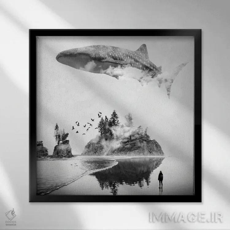 «جزیره کوسهنهنگ» اثرِ «دیوید لوبلاو» با تایپوگرافیِ کنترلشده، روی دیوار خوب مینشیند؛ برای کنار کتابخانه، میز کار یا راهروهای باریک عالی است.