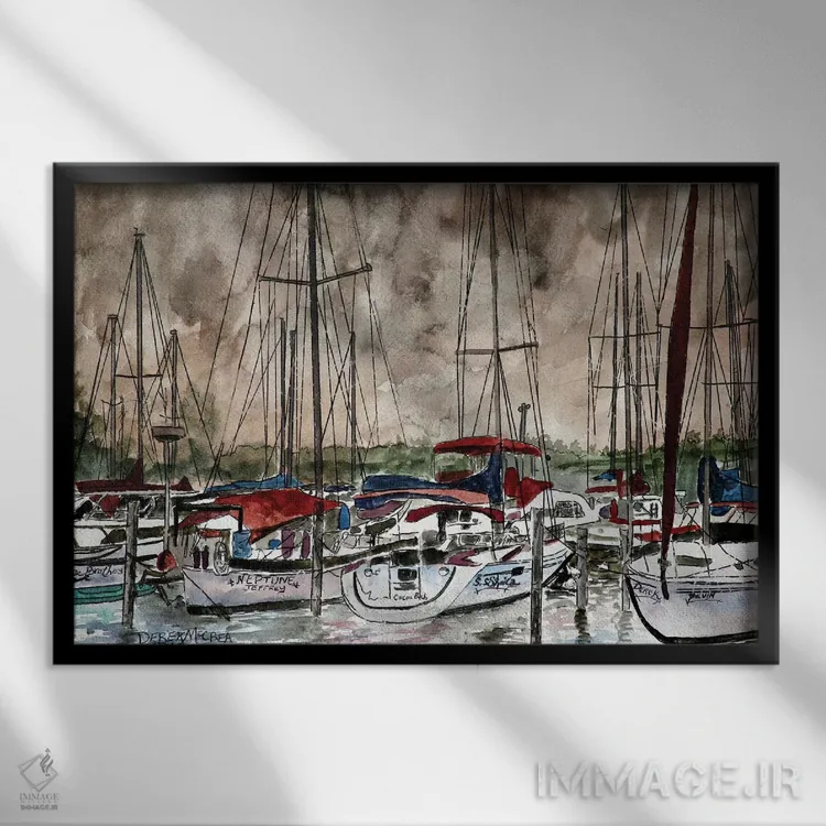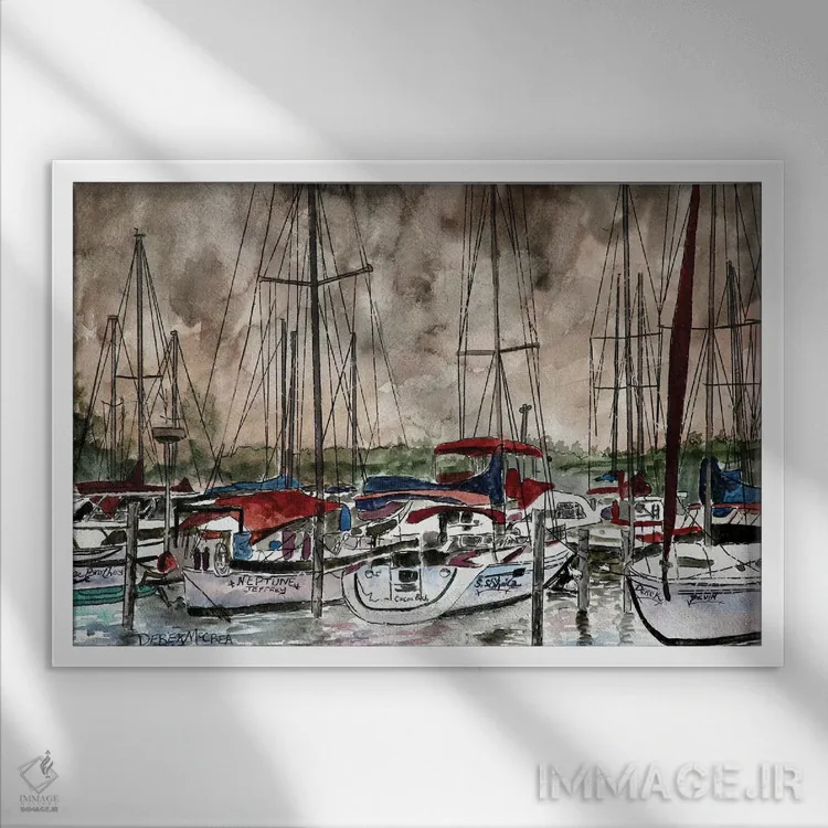 تابلو قایق‌های بادبانی در شب اثر درک مک‌کری - نمای قاب‌دار مشکی