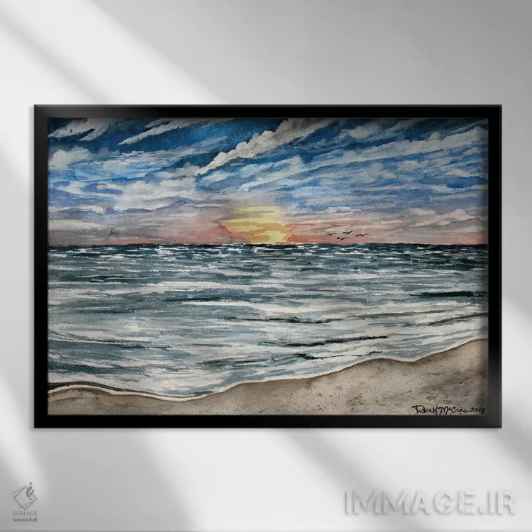 «چشمانداز دریایی هنگام غروب» اثرِ «درک مککری» با رنگوبوی ساحل و موضوعِ این اثر، برای راهرو، بالای کنسول یا دیوار شاخصِ پشت مبل انتخاب مناسبی است.