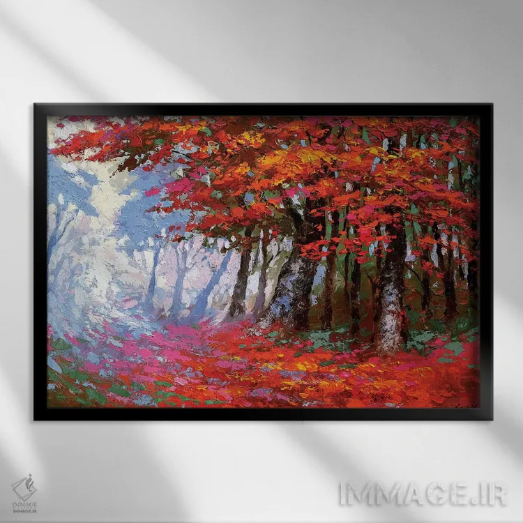 برای دیواری که میخواهید نرمتر دیده شود، «پاییز سرخ» اثرِ «دمیتری اسپیروس» تعادل رنگیِ لطیفی به چیدمان میدهد؛ برای فضای غذاخوری انتخابی خوشسلیقه است. حضورش آرام است، اما بیاثر نیست.