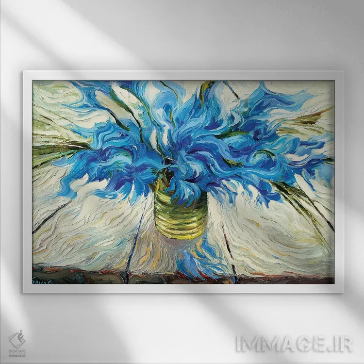 برای اتاق خواب و نشیمنهای آرام، «دسته گل آبی» اثرِ «دمیتری اسپیروس» جزئیات نزدیک را چشمنواز نشان میدهد؛ برای کنار میز آرایش یا کنسول انتخابی خوشسلیقه است. برای دیوار گالری هم ترکیبپذیر و خوشنشین است.