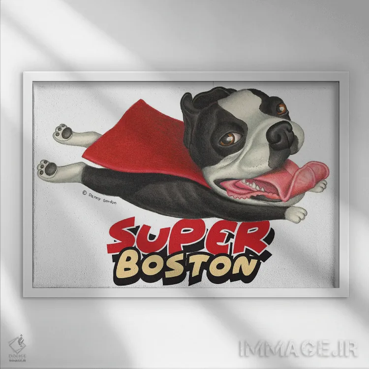تابلو تریر بوستون پروازکنان با شنل قرمز اثر دنی گوردون - نمای قاب‌دار سفید