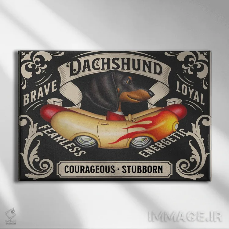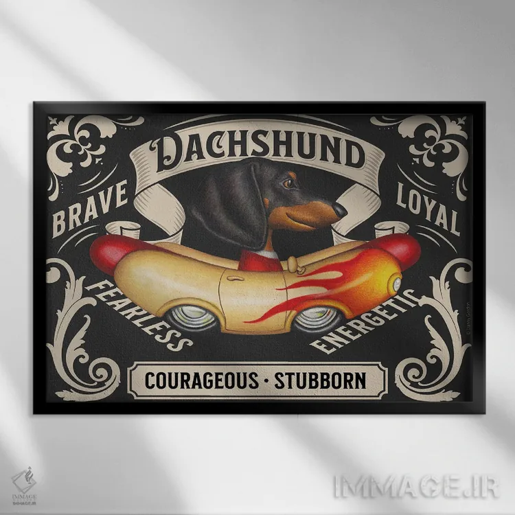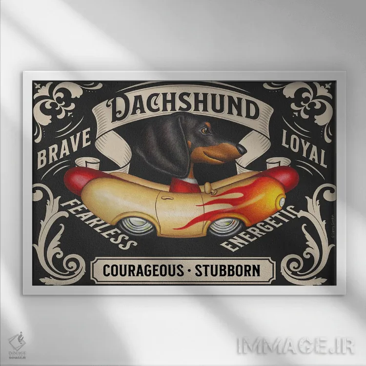 برای اتاقی که به یک عنصر دوستداشتنی نیاز دارد، «تمبر افقی داشهوند مشکی در خودروی سوسیسی شعلهدار» اثرِ «دنی گوردون» مثل یک امضای بامزه اما متین عمل میکند؛ برای خانههایی با چوب و پارچههای گرم انتخابی خوشسلیقه است. با قاب چوبی یا مشکی، حس مرتبتری پیدا میکند.