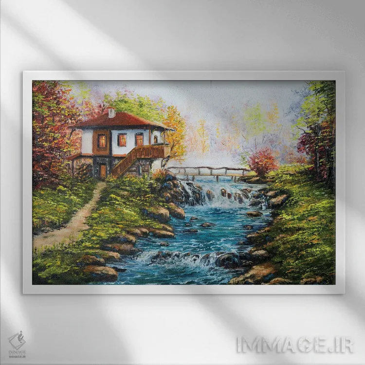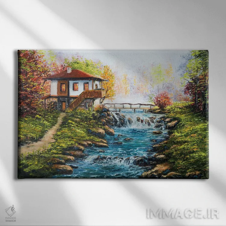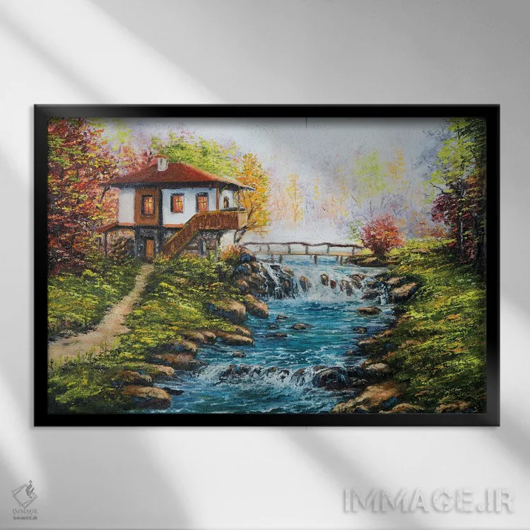 تابلو خانه سنتی بلغاری و رودخانه‌ای در کوهستان اثر بورو‌جُینت - نمای پرسپکتیو محصول