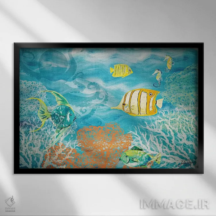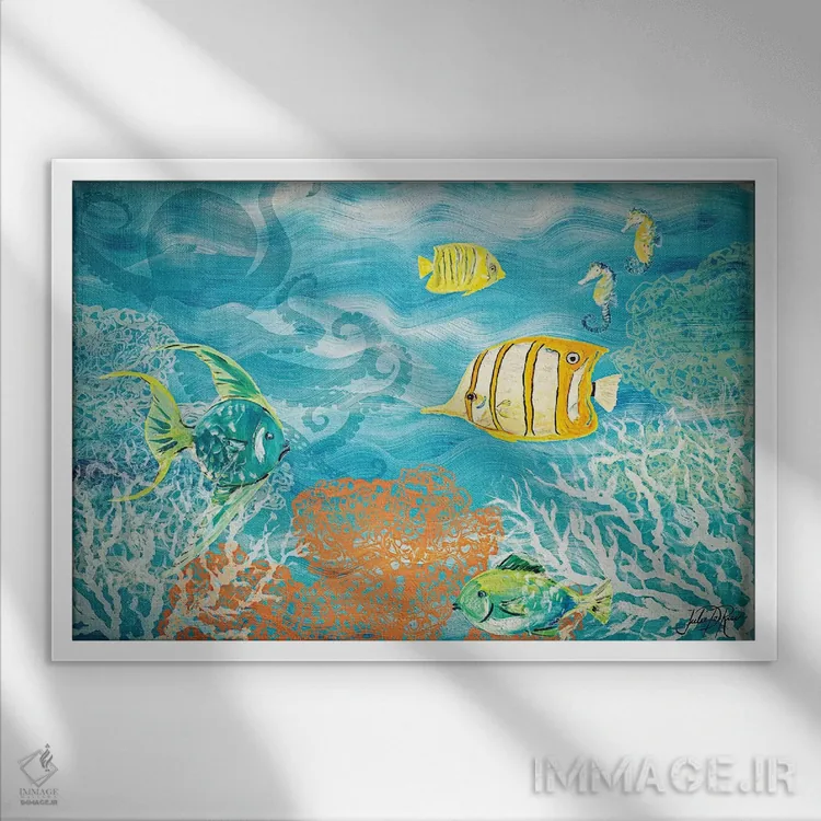 در «زیر دریا» اثرِ «جولی دریسه»، حضور حیوانات در کنار رنگهای خنثی، تضاد دلچسبی میسازد؛ برای اتاق بازی یا گوشهٔ مطالعه انتخابی خوشسلیقه است. به دیوار، قصه میدهد—اما قصهای آرام و شیک.