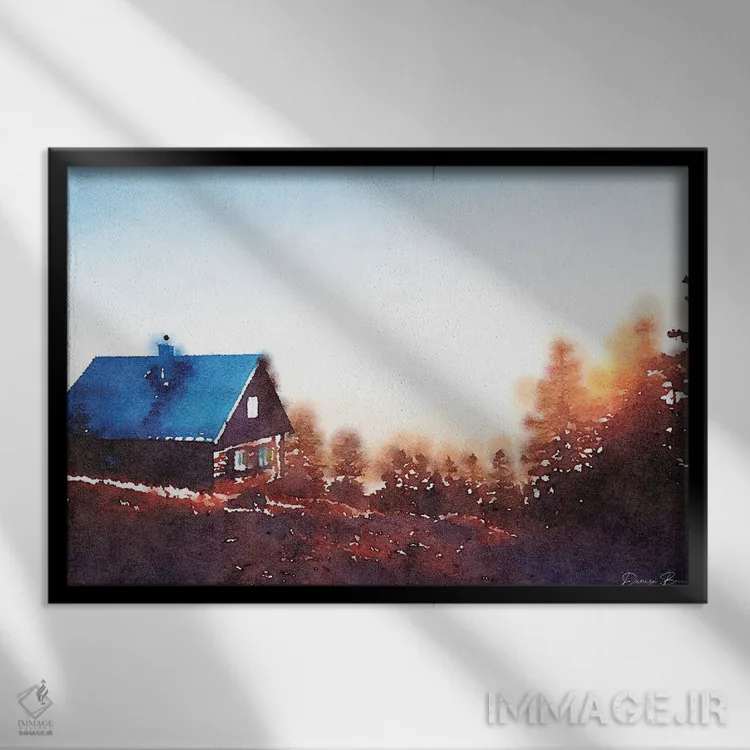 «کلبه روی تپه» اثرِ «دنیس براون» بازیِ دقیقِ خط و هندسه است؛ حس معاصر و منظم به دکور بدهد؛ برای فضاهای اداری انتخابی خوشسلیقه است. با قاب مشکی مات، جلوهٔ تمیزتری پیدا میکند.