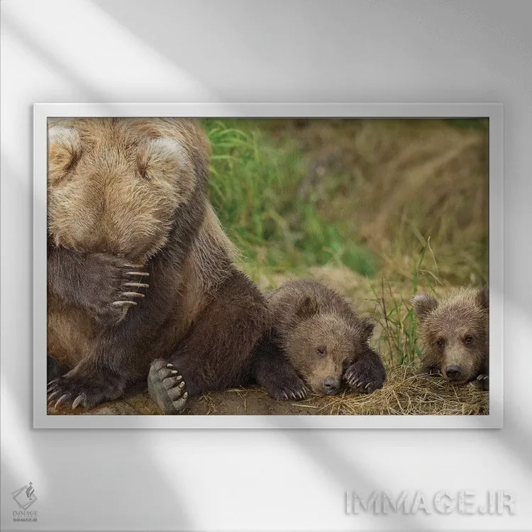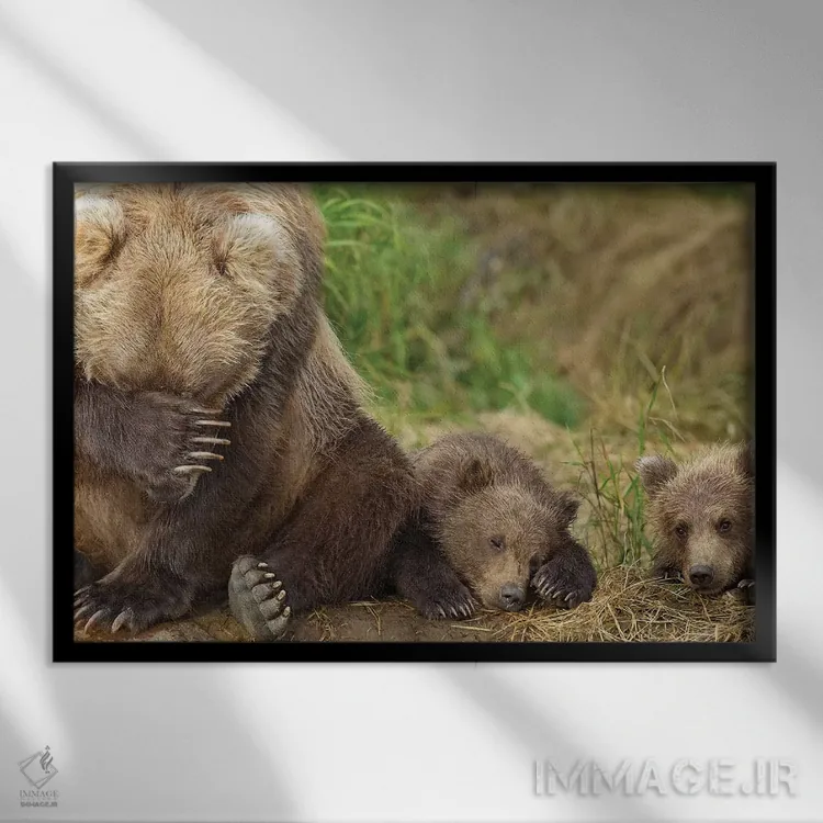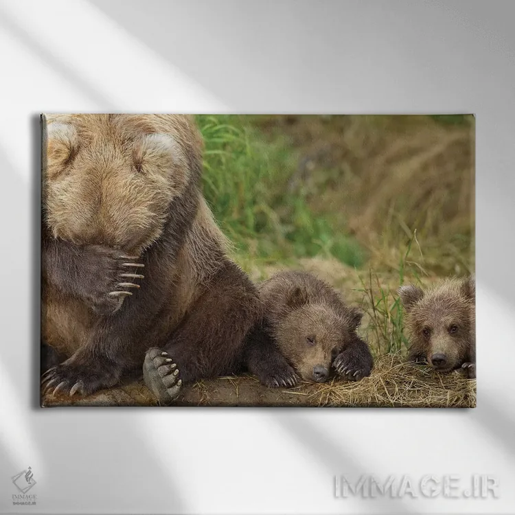 تابلو مادر خرس قهوهای و تولههایش در حال استراحت در ساحل گریزی کریک، پارک ملی کاتمای، جنوب غرب آلاسکا، تابستان اثر دیزاین پیکس